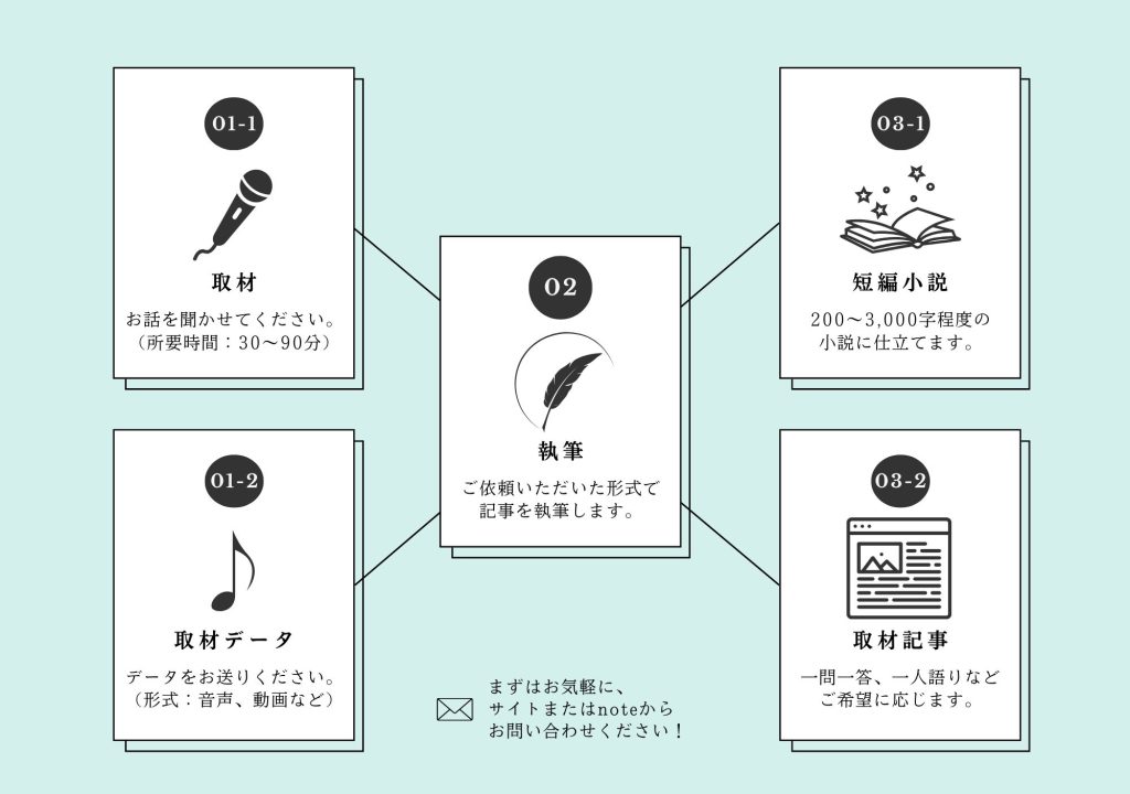 インタビュー内容、またはお打ち合わせの内容に応じて短編小説を執筆いたします。